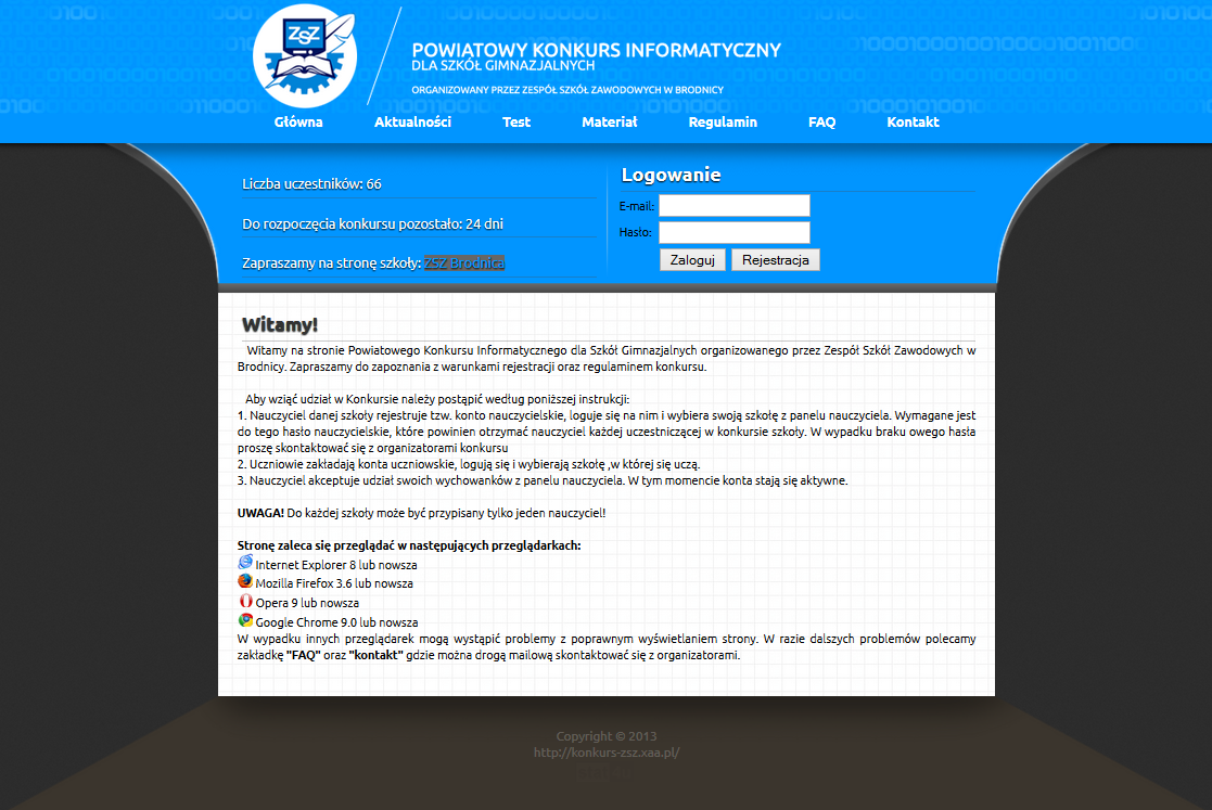 W wypadku innych przeglądarek mogą wystąpić problemy z poprawnym wyświetlaniem strony. W razie dalszych problemów polecamy zakładkę "FAQ" oraz "kontakt" gdzie można drogą mailową skontaktować się z organizatorami.